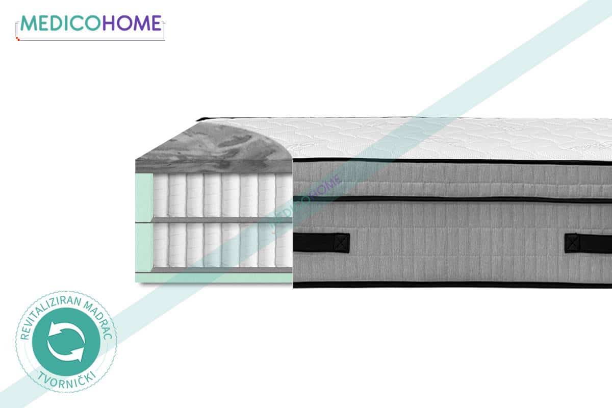 Revitalizirani Medico Home madraci su madraci iz povrata u sklopu Sleep Trial probnog perioda, a na kojima ne postoji niti jedna tvornička pogreška. Ispravni su, pažljivo pregledani i spremni za korištenje. Revitalizirani madraci su potpuno dezinficirani, odnosno očišćeni i njihova navlaka je zamijenjena, to jest potpuno nova i nekorištena.
